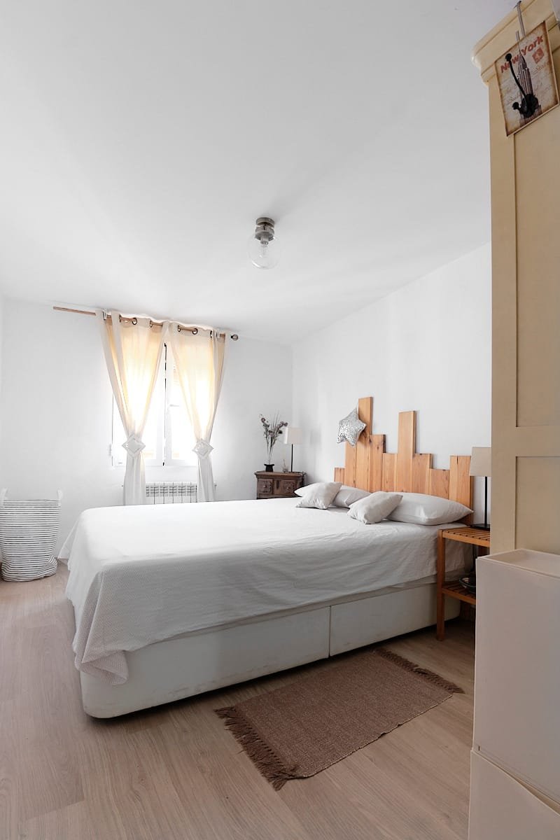 La habitación principal dispone de una cama de matrimonio, armario amplio y ventilación natural. El baño completo incluye bañera, toallas, secador y amenities básicos. Además, el pasillo está aprovechado como espacio de almacenaje decorativo y práctico.